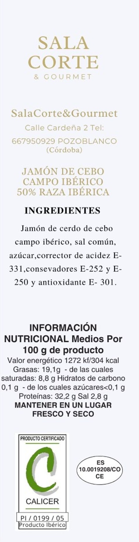 Jamón de cerdo de cebo campo ibérico, sal común, azúcar, corrector de acidez E331, conservadores E-252 y E-250 y antioxidante E-301.