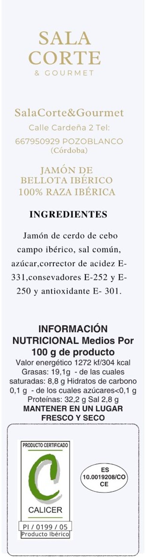 Jamón de cerdo de cebo campo ibérico, sal común, azúcar, corrector de acidez E-331, conservadores E-252 y E-250 y antioxidante E-301.
